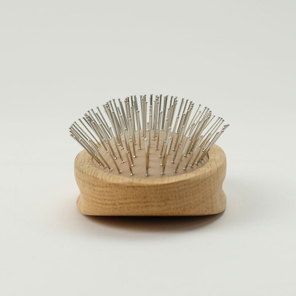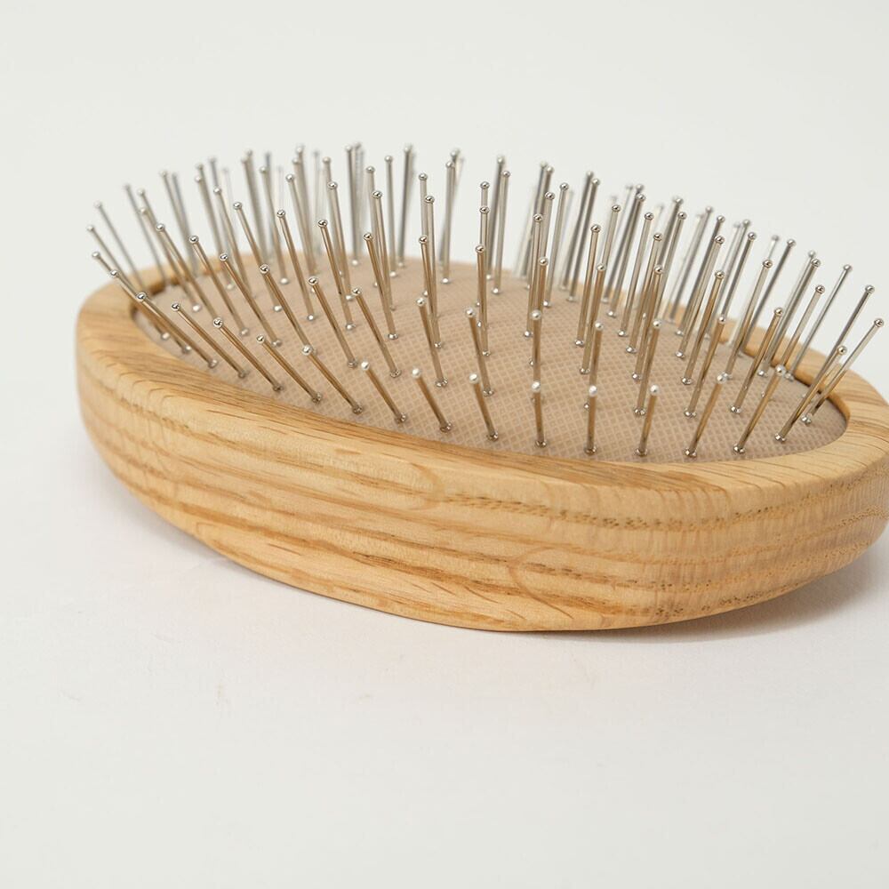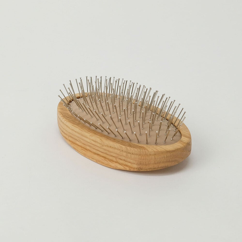 手になじむオーク材のハンドルは、インテリアにも自然と溶け込み、日々のケアに取り入れやすい佇まいです。スチール製のピンは目が粗めで、被毛にやさしくアプローチ。ブラッシングに敏感な子にも負担が少なく、やさしいマッサージ用途にも活躍します◎