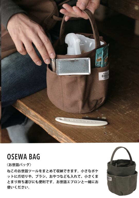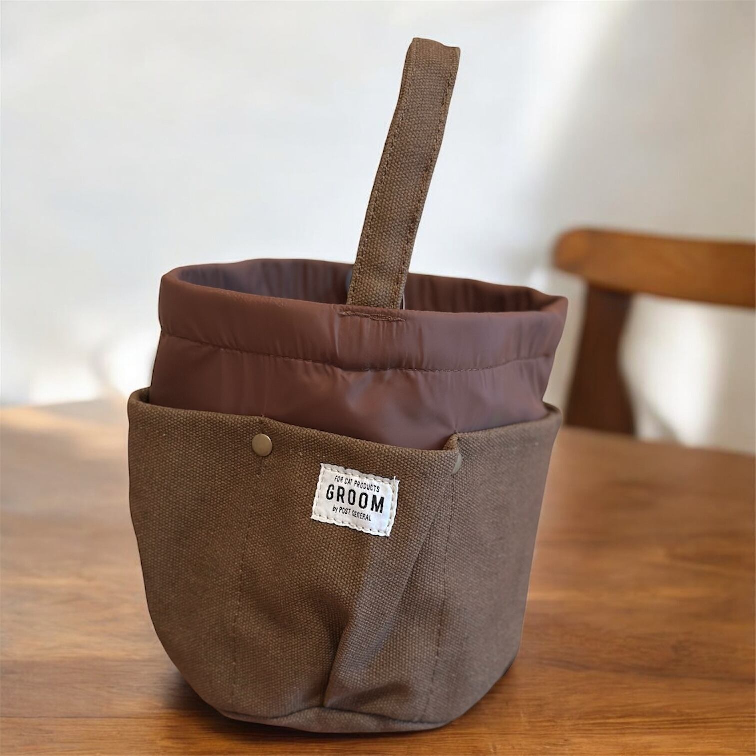 愛猫のブラシや爪切り、おやつなどのお世話アイテムをまとめて収納できるGROOMシリーズのお世話バッグです。