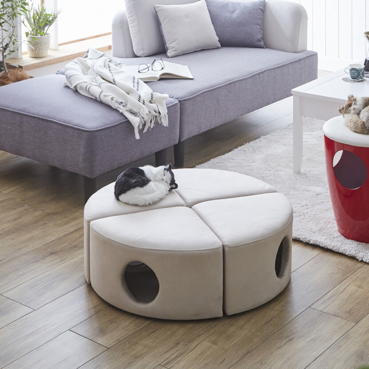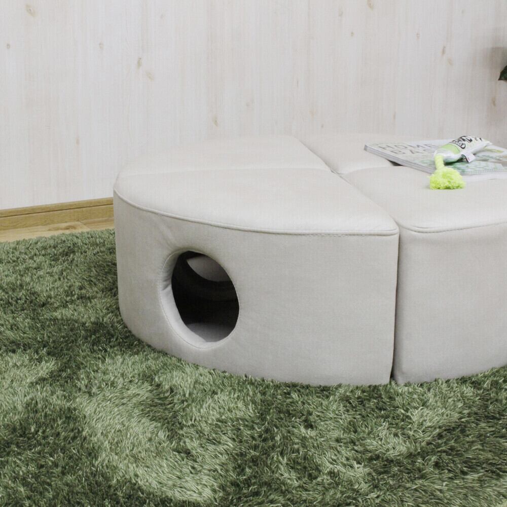 三面に穴が開いたチーズ型デザインなので、4個(2セットの購入となります)をつなげてソファ風にアレンジしたり、丸く囲って猫ちゃんの基地スペースにしたりと自由な使い方ができます。