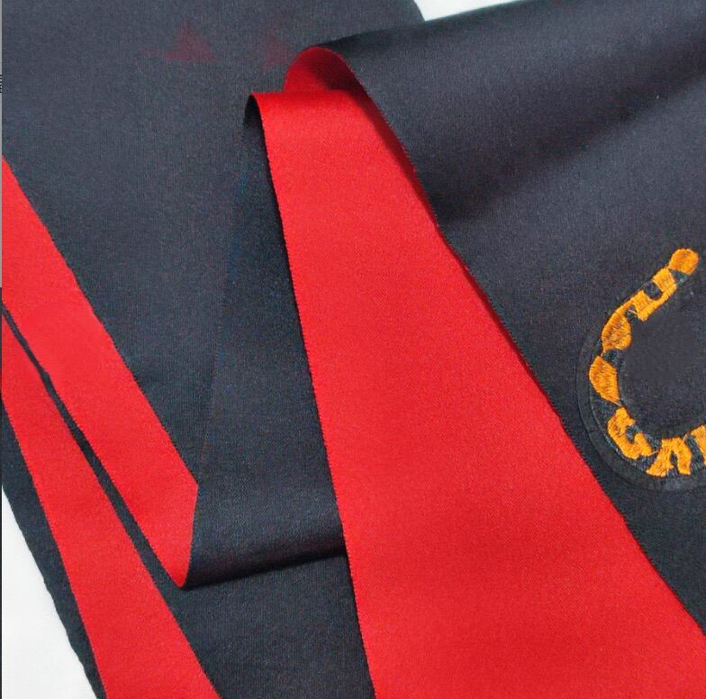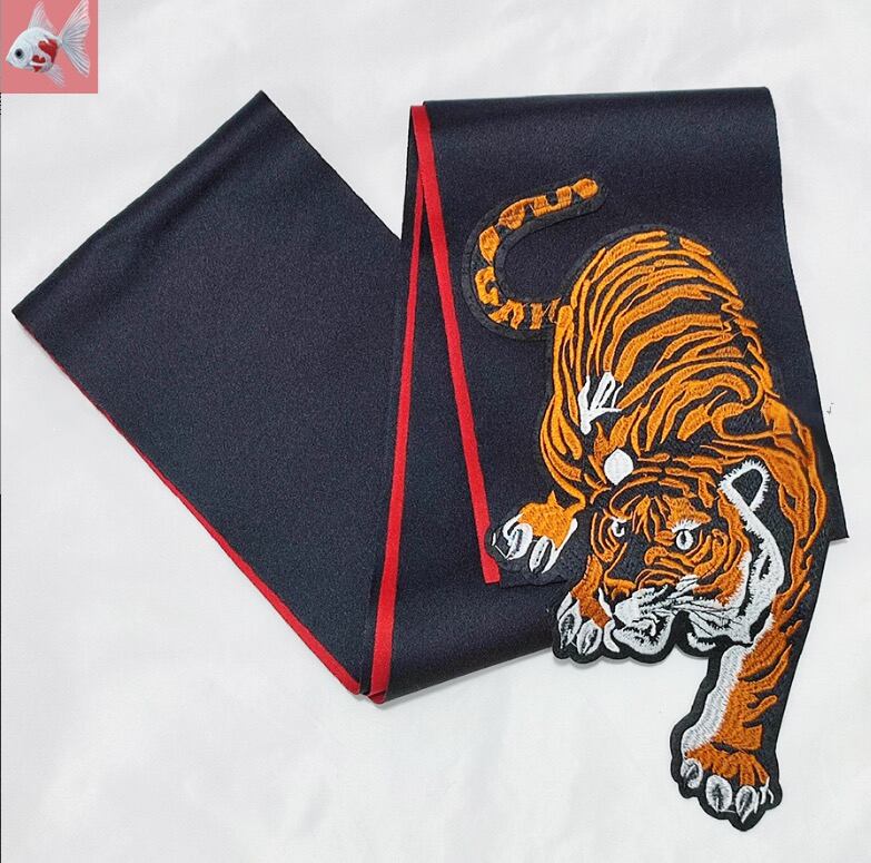 黒と赤の生地に、力強くも美しい刺繍の虎があしらわれた半幅帯です。