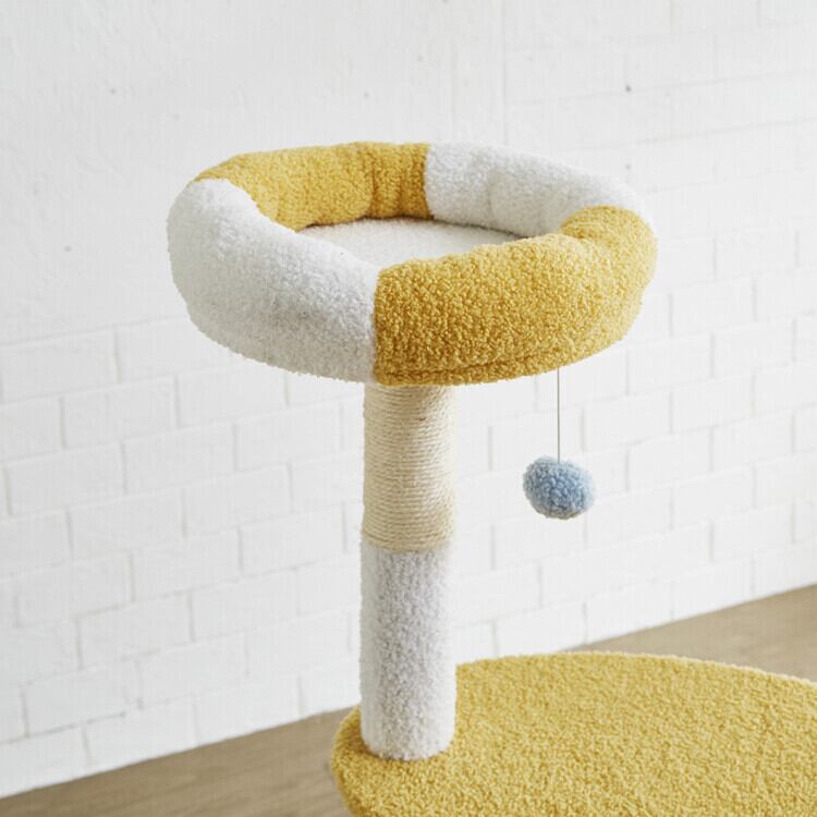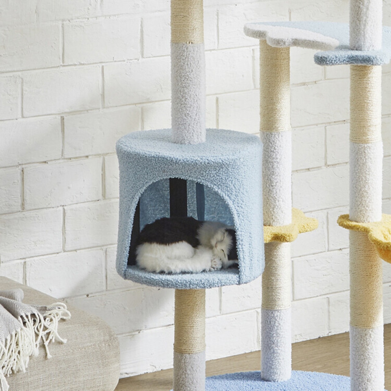 ふわふわボア生地とやさしいパステルブルーが可愛い、おしゃれなキャットタワー。