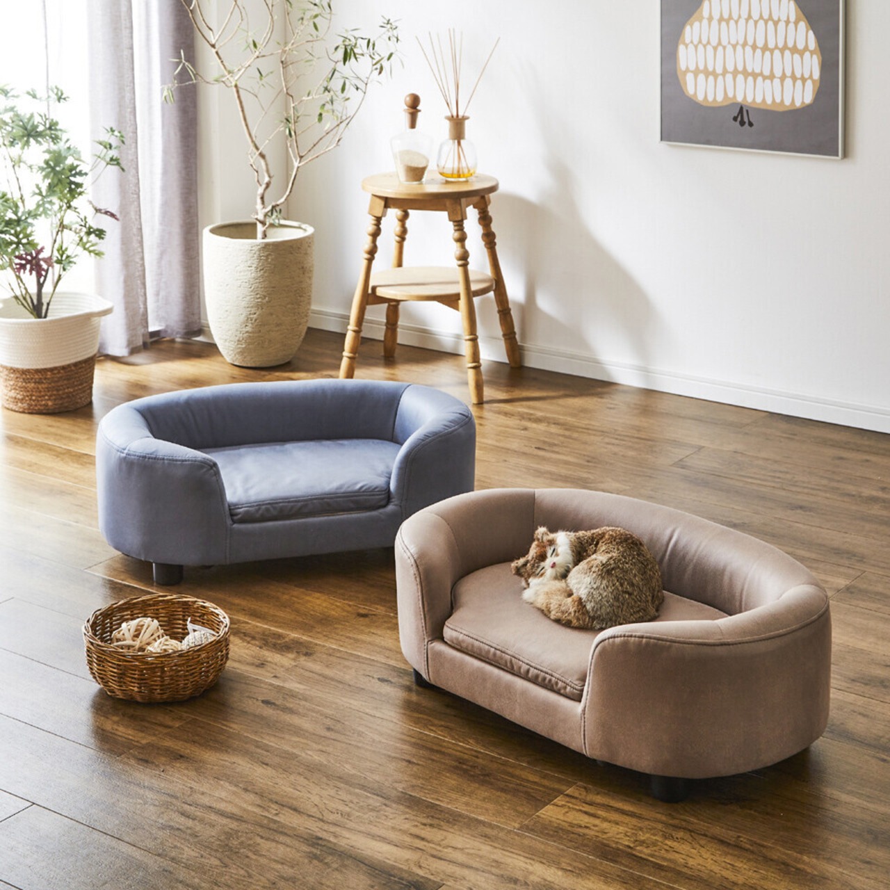 ライトブラウンとブルーの2色からお選びいただける、機能性もデザインも嬉しいペットソファです。