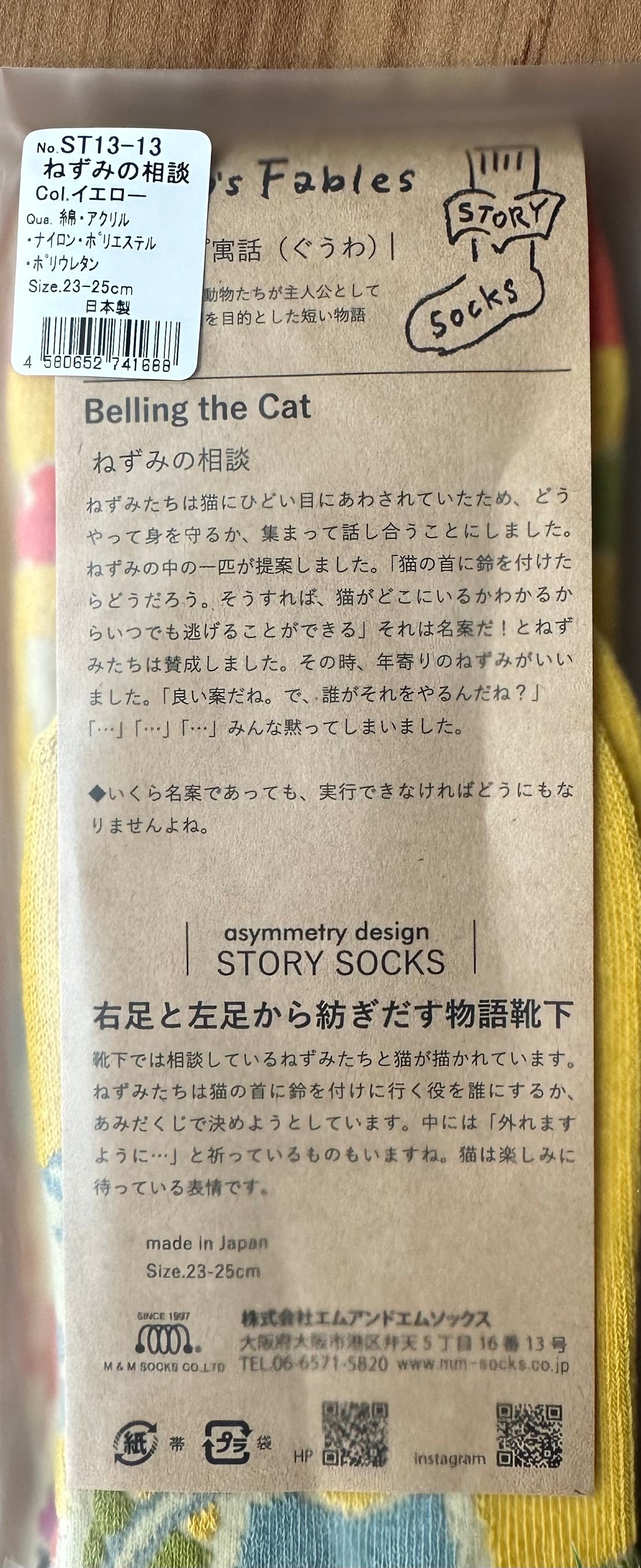 ねずみたちが猫に鈴を付ける作戦を話し合う場面をユーモラスにソックスに表現しました。