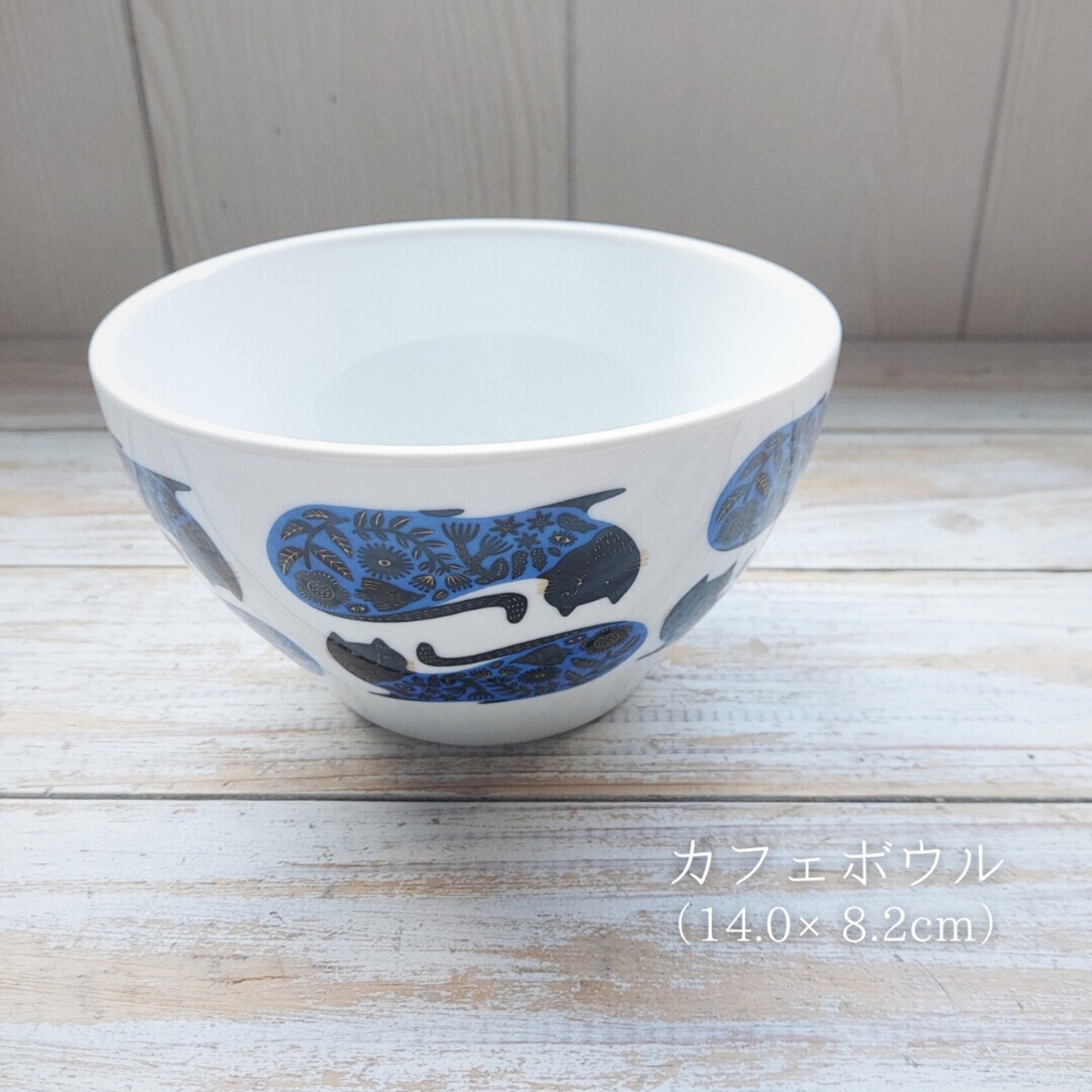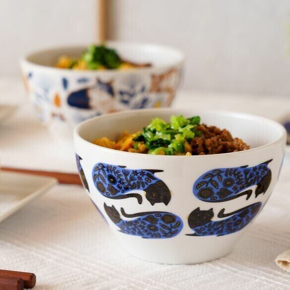 鮮やかな藍色に黒猫と花模様が映える、美濃焼のカフェボウル。