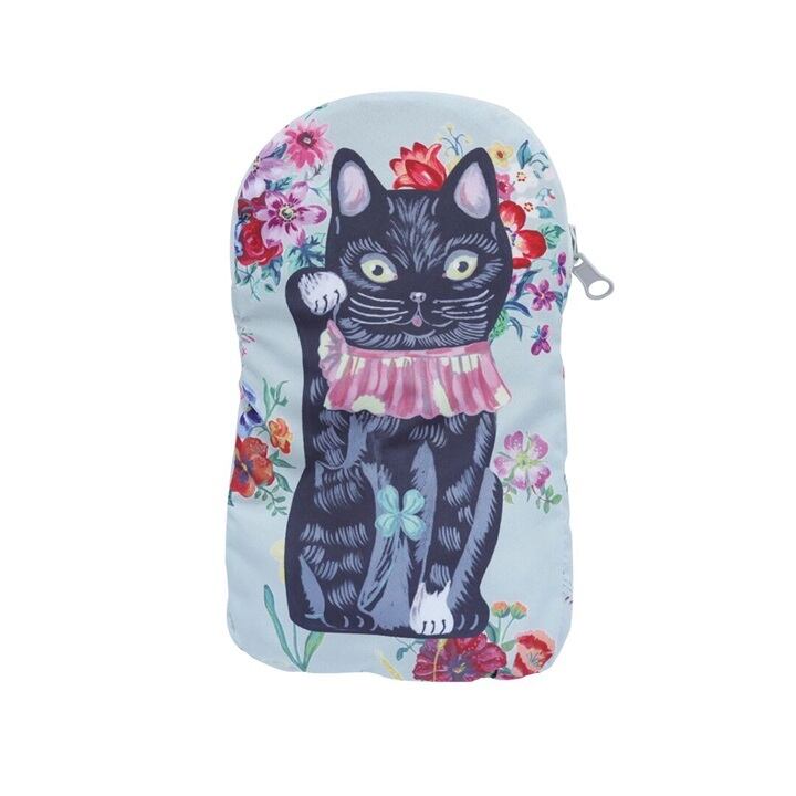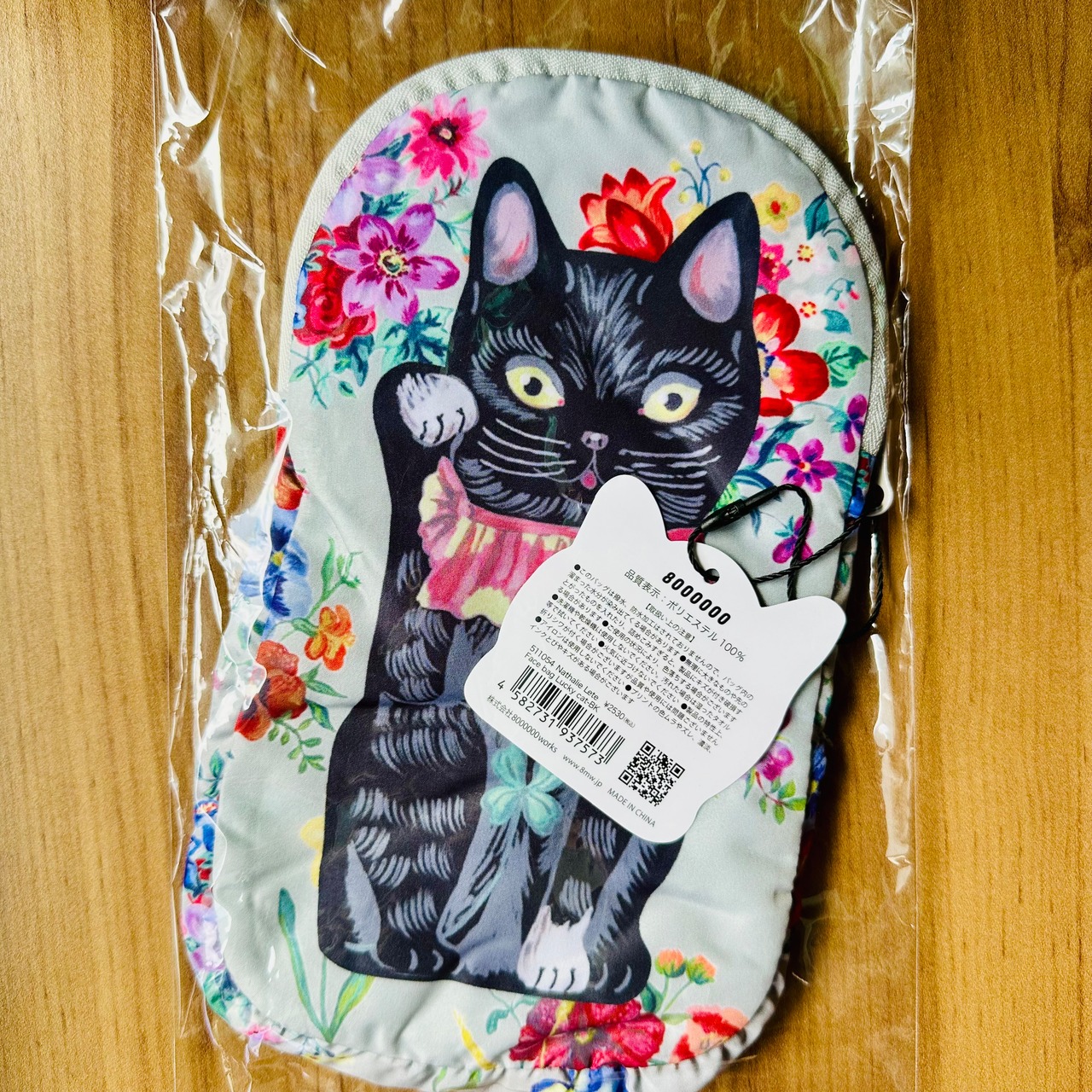 白地にボタニカル柄をバックに、中央には右手を曲げた黒猫の招き猫が描かれ、かわいいながらもシックな印象です。