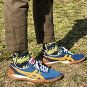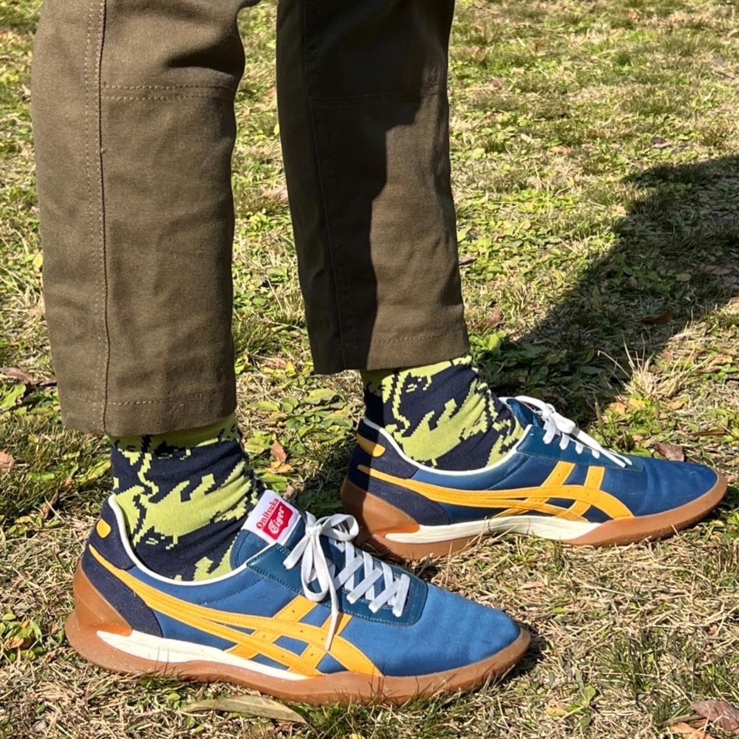 ネイビーとの組み合わせで派手すぎず、それでいて遊び心たっぷり◎