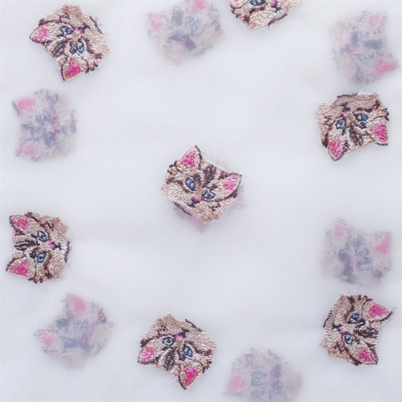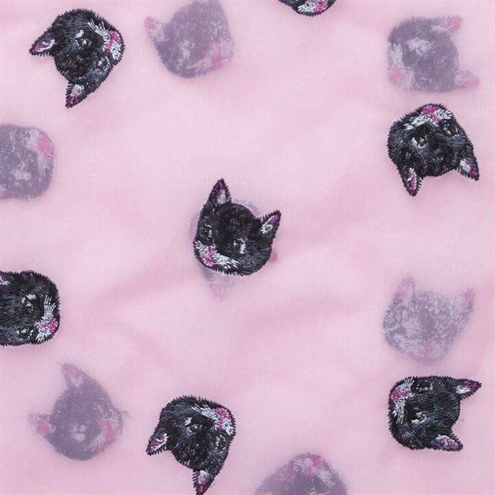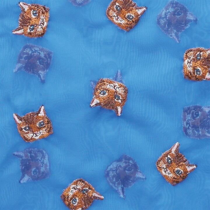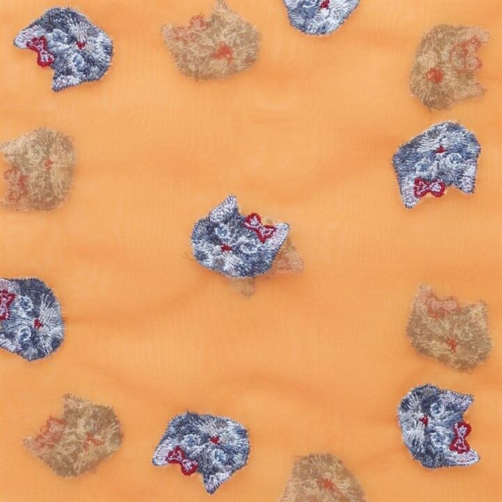 透け素材のオーガンジーにカラフルな刺繍で描かれた猫デザインが印象的です。