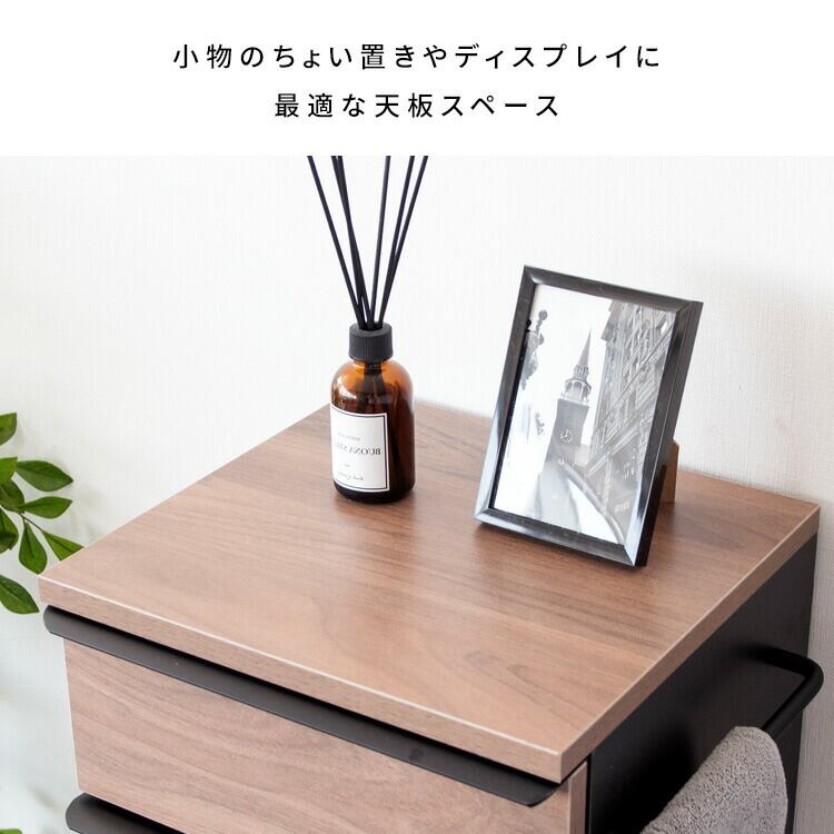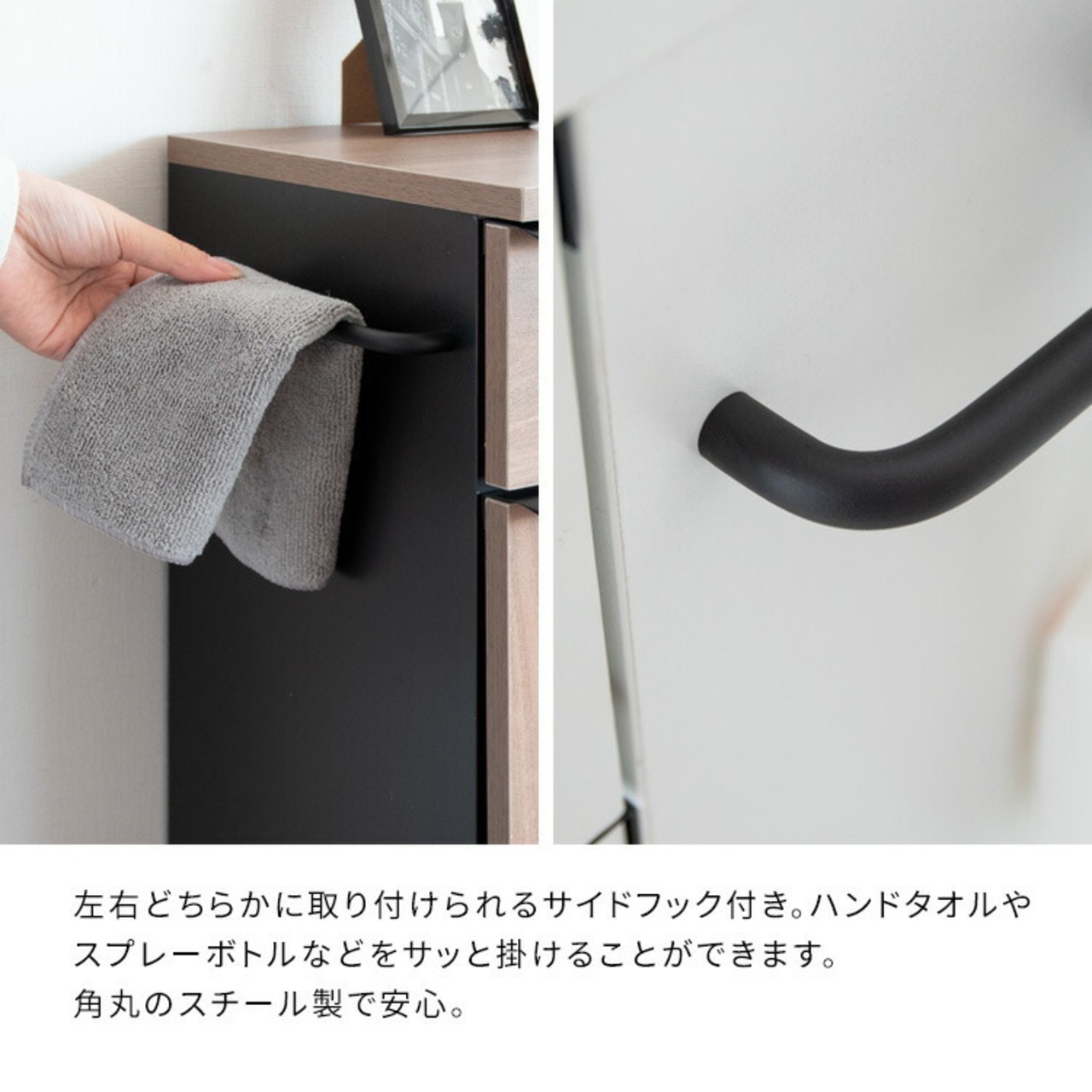 引き出し・ハンガーバー・下棚・天板・サイドフック付きで、必要なものをひとまとめに。