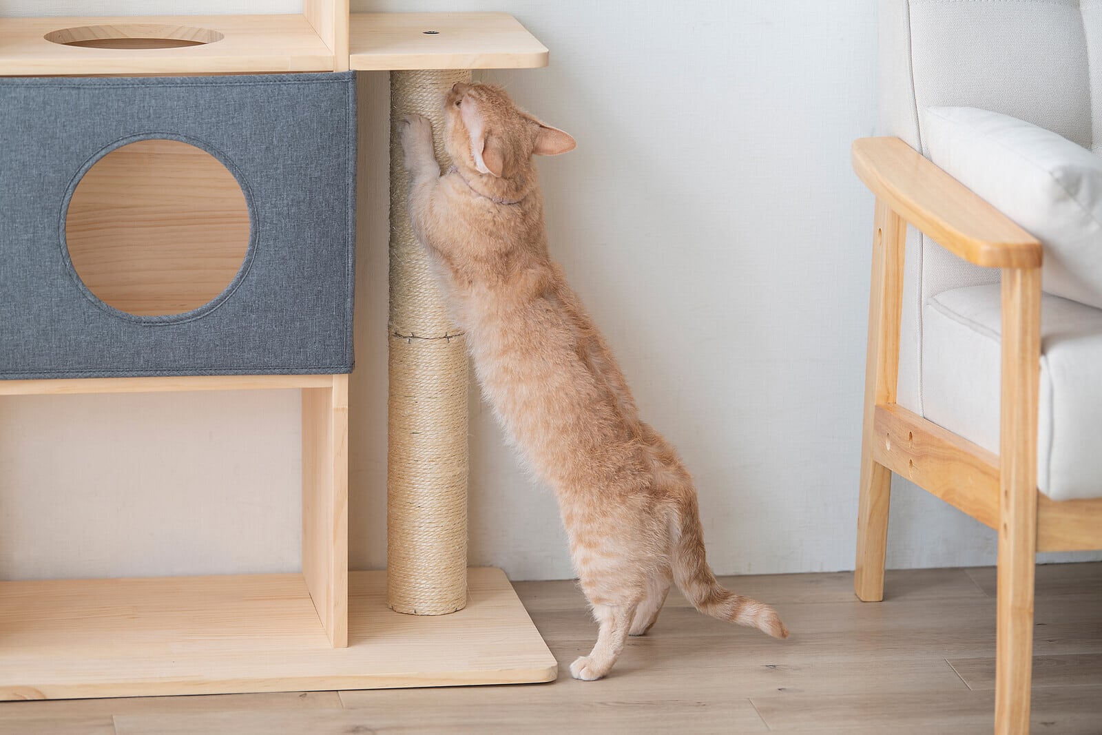 立ってのびのび爪とぎできる麻縄ポール付き。