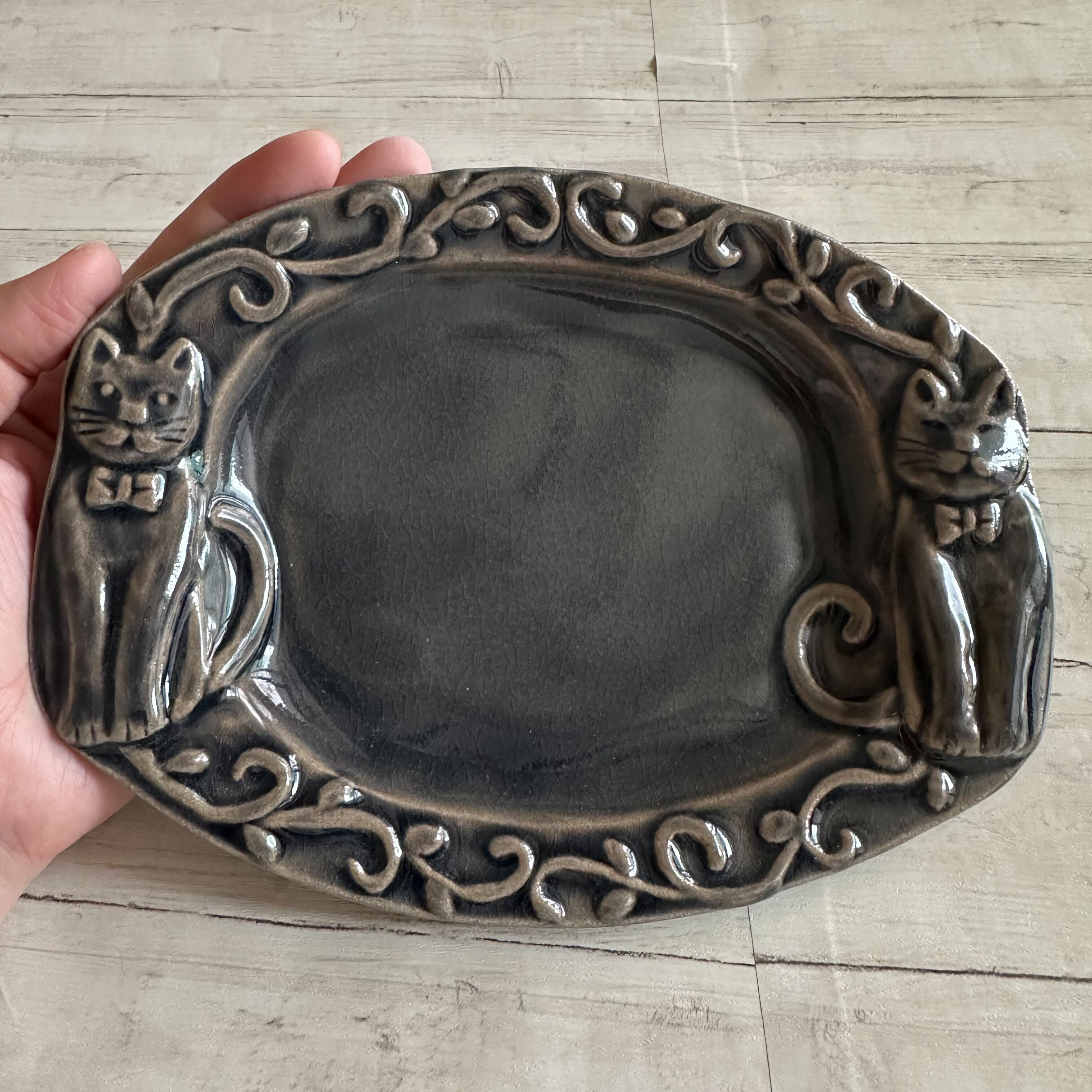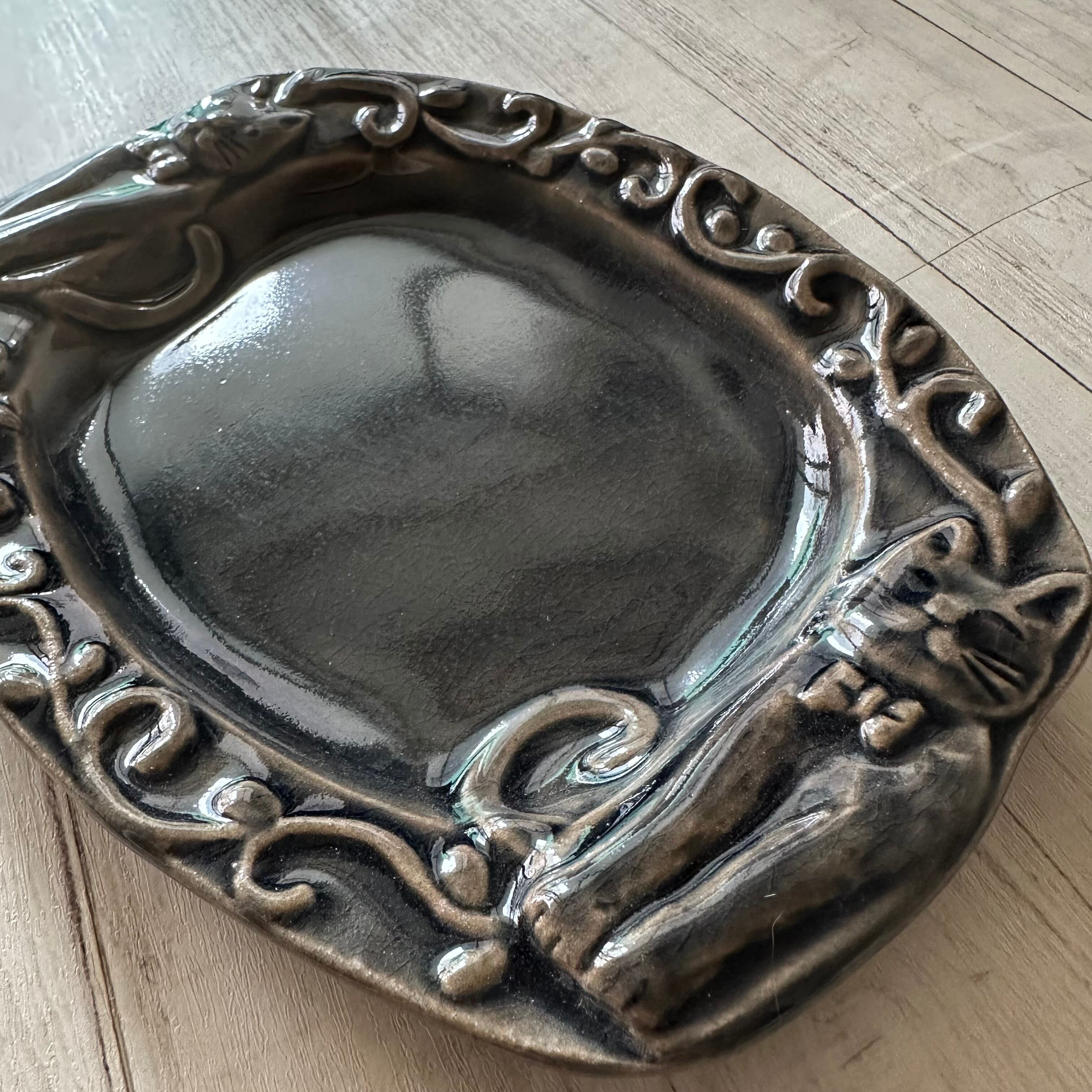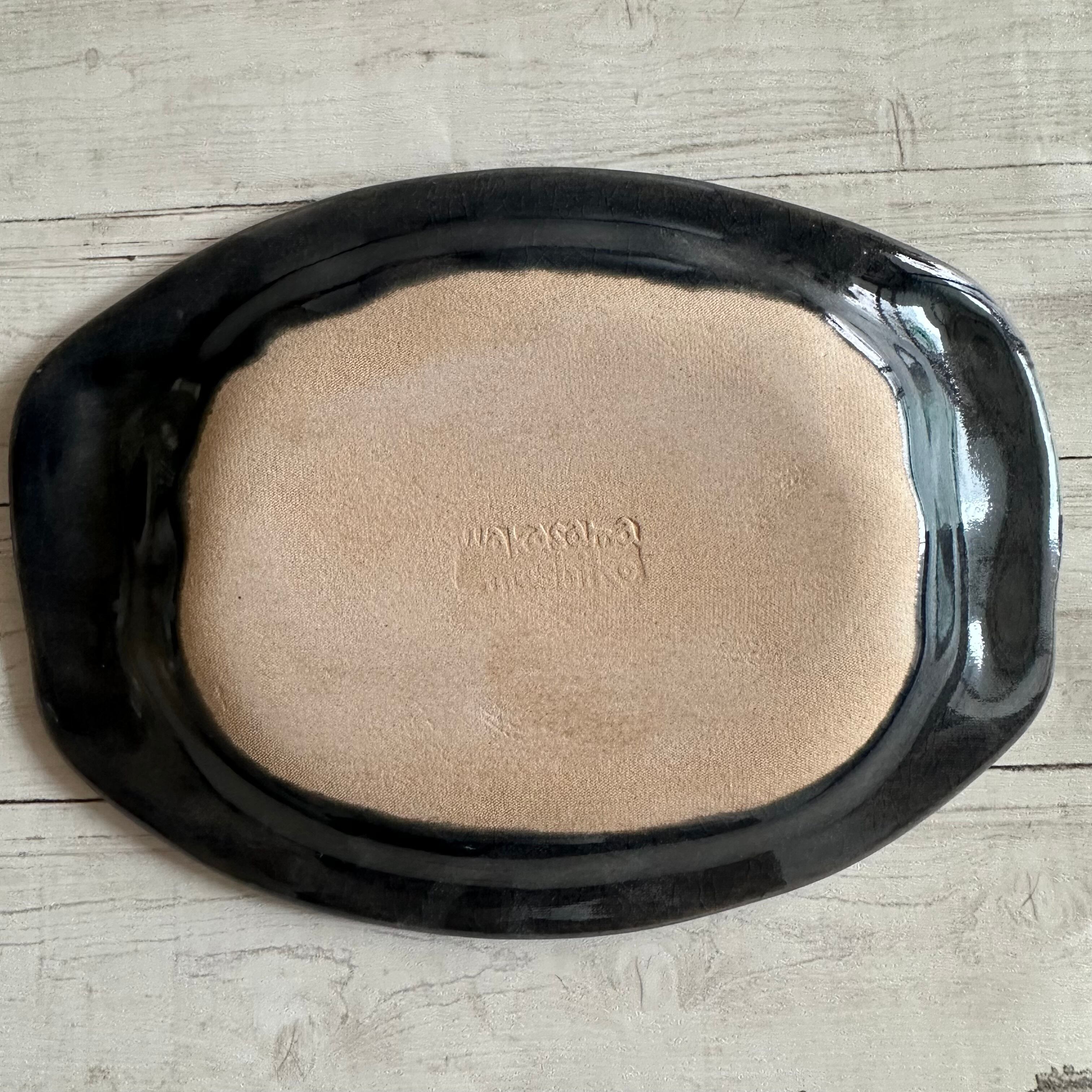 お色はお皿のほうが、黒に近い深い色合いの中に、わずかに緑を含んだニュアンスカラー