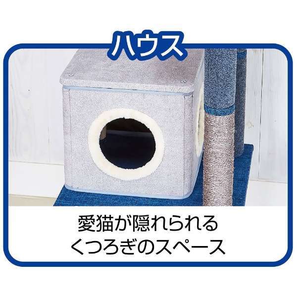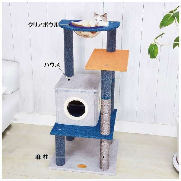 クリアボウルの透明感と青のモダンカラーがおしゃれなキャットタワーです。