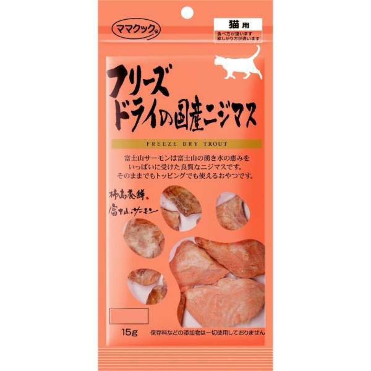 ペット用フリーズドライのリーディングカンパニー ママクック社の「フリーズドライの国産ニジマス 15g 」です。