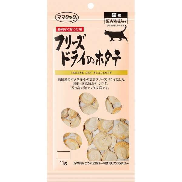 ペット用フリーズドライのリーディングカンパニー ママクック社の「フリーズドライのホタテ 11g」です。
